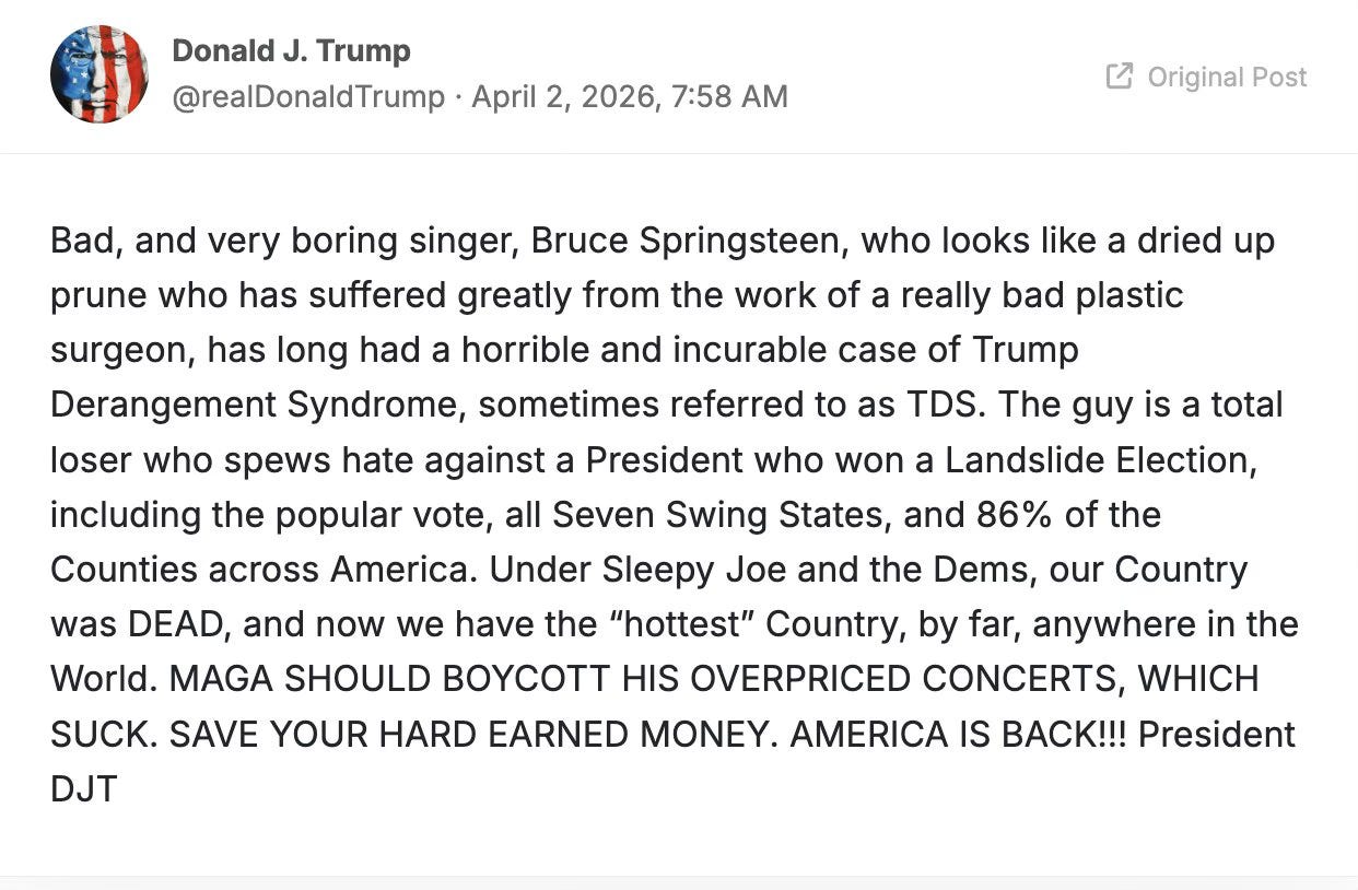 A question (an easy one): If Bruce Springsteen were pro-Trump, instead of anti-Trump, would the president judge him a “bad” and “very boring” singer who “looks like a dried up prune,” etc.?