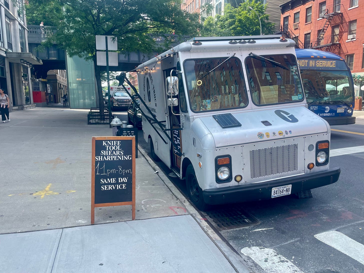 In “olden times,” peddlers would often sharpen your knives and scissors and whatnot. They would do this from their wagons, out on the plains. Would you like to see a modern-day equivalent, on the streets of Manhattan (New York, not Kansas)?