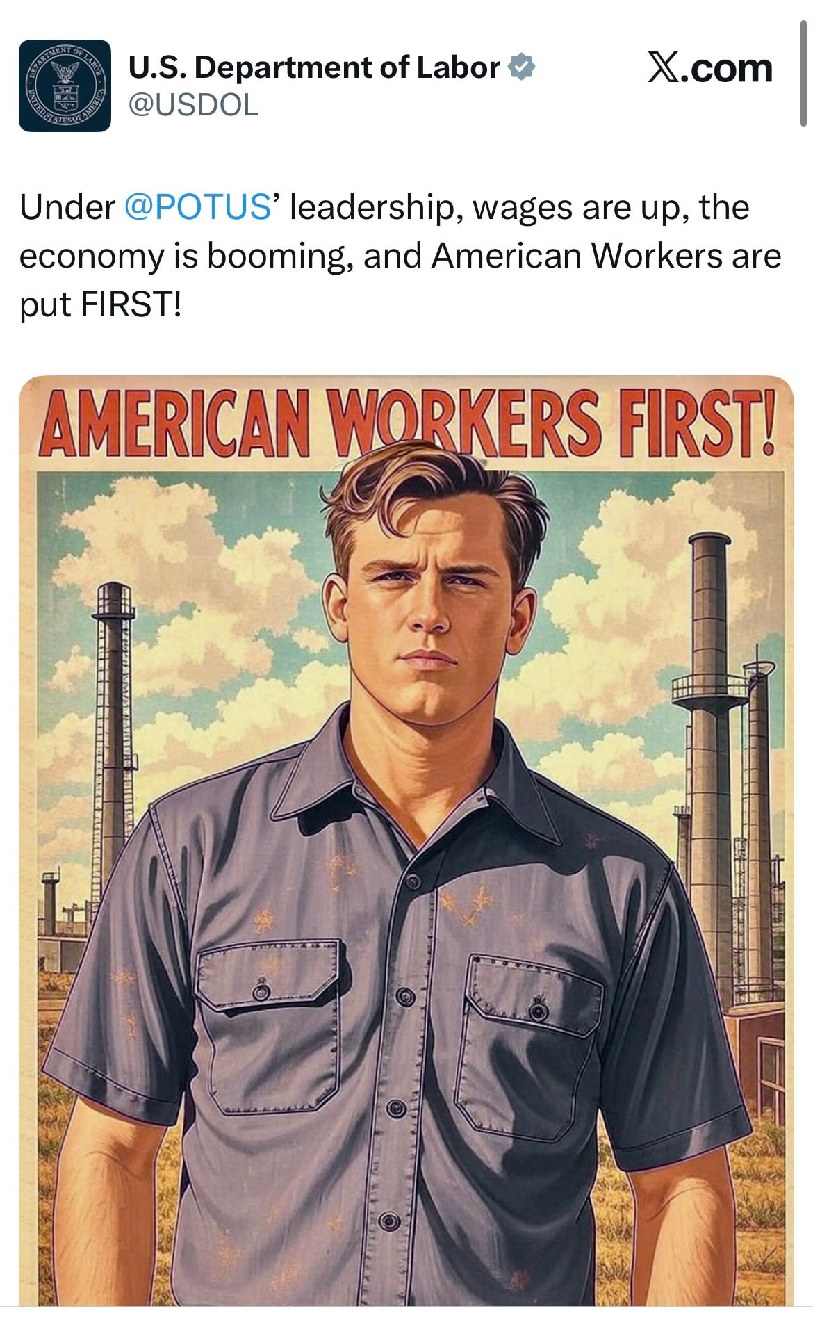 In a cabinet meeting—one of those nauseating North Korean affairs, where the members bathe the Dear Leader in flattery—the labor secretary, Lori Chavez-DeRemer, said, “Mr. President, I invite you to see your big, beautiful face on a banner in front of the Department of Labor.” She added, “You are really the transformational president of the American worker.”