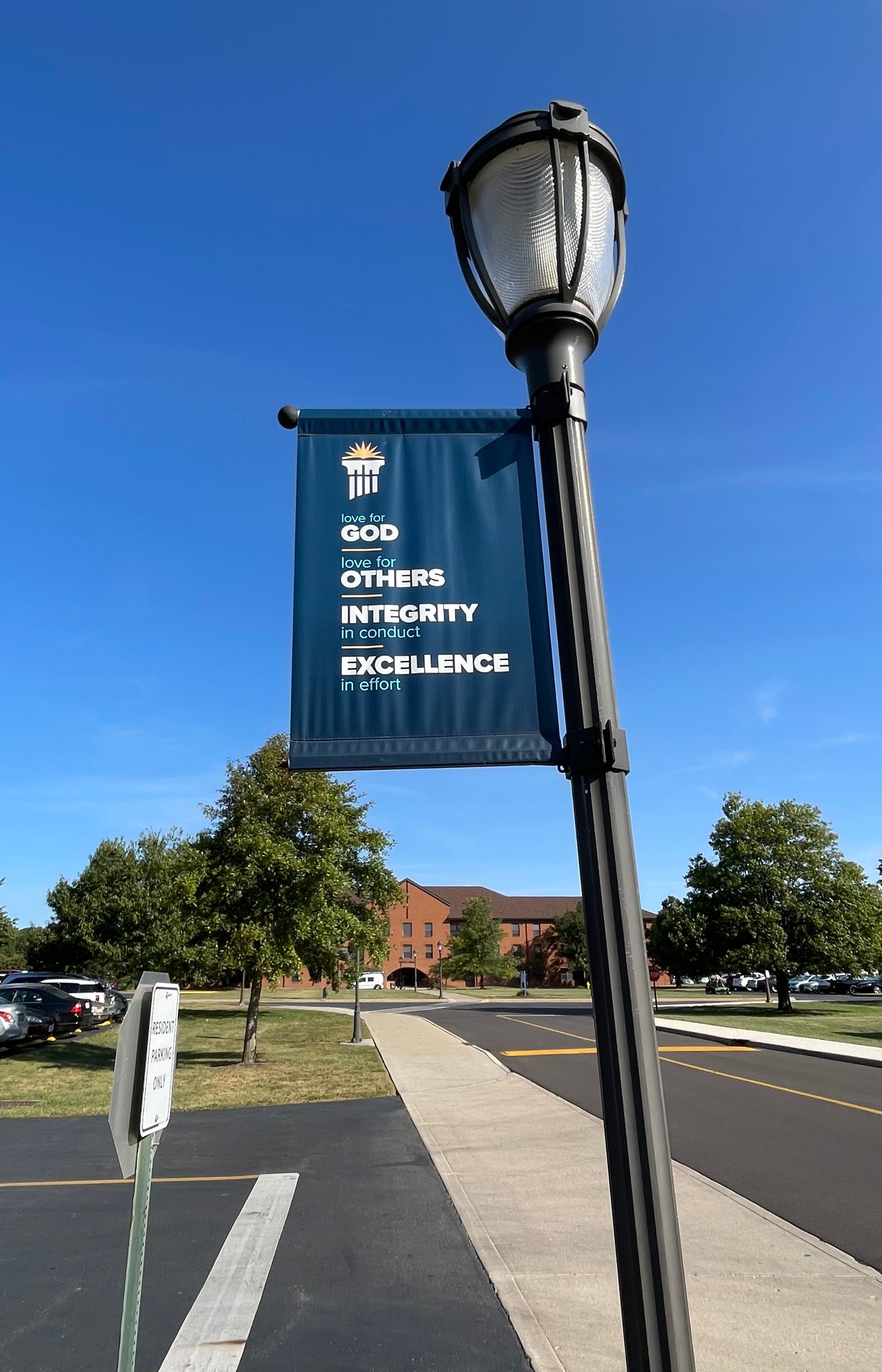 CU—Cedarville University—is a little younger than Antioch. It was founded in 1887. It is a Christian university, with daily chapel. Here is one of the many banners on campus: