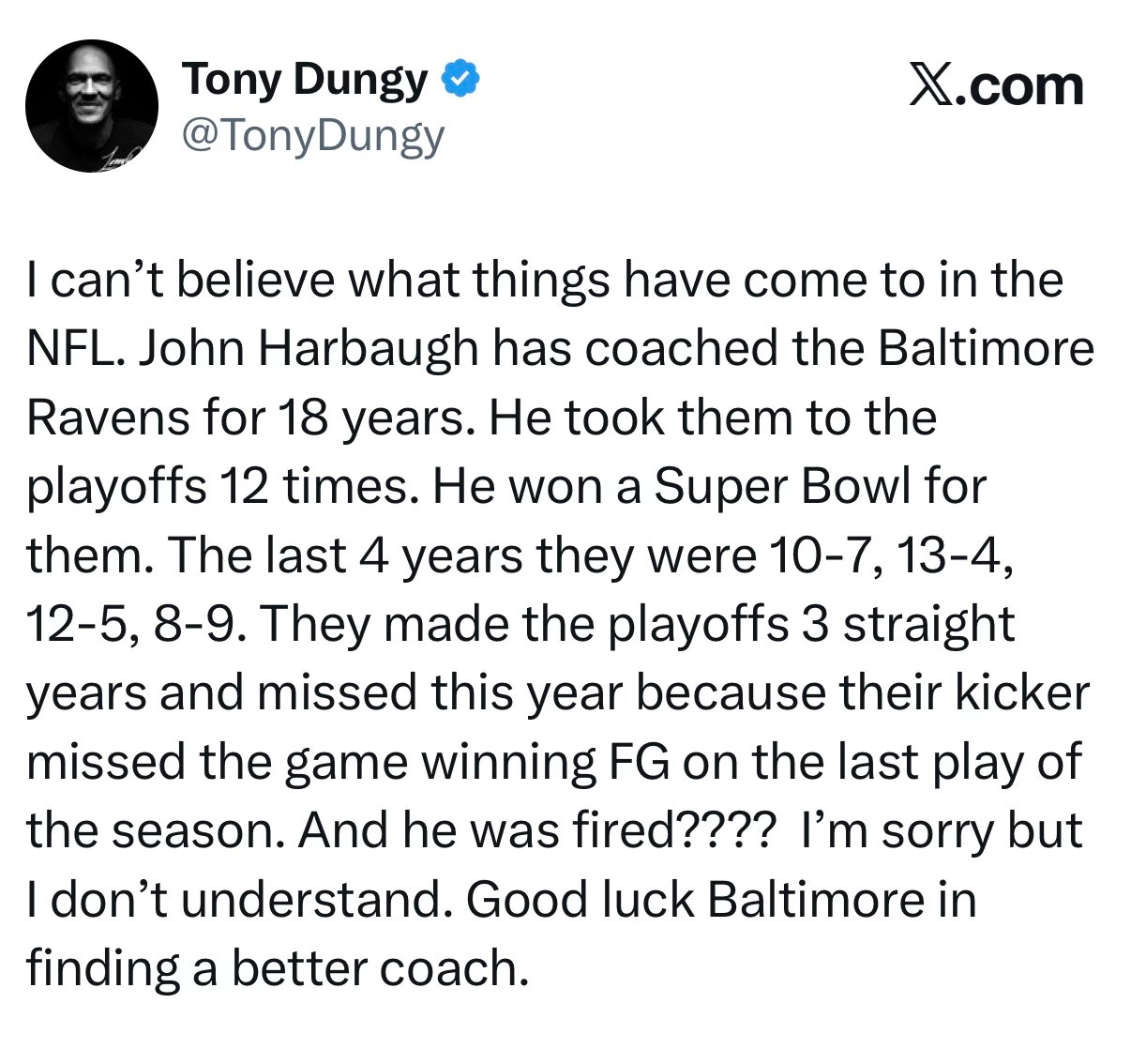 As you probably know, John has been the head coach of the Baltimore Ravens for 18 years. He is synonymous with the franchise, as far as I’m concerned.