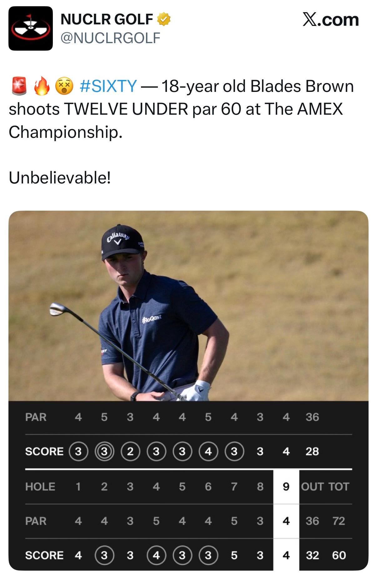 For generations, golfers played with “blades”—“bladed clubs.” Then “cavity-backed clubs” came in, much easier to hit. If Blades Brown shot 60 with the current equipment, I bet he could have shot 70 with the old blades—which would have been ... amazeballs.