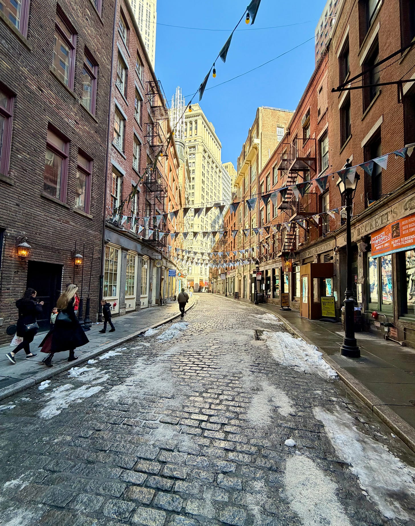 I don’t know what the weather will be today, but yesterday in New York was warm and sunny. Here’s a shot of a street in Lower Manhattan. Very New Yorky, I thought. A classic New York “vibe.”