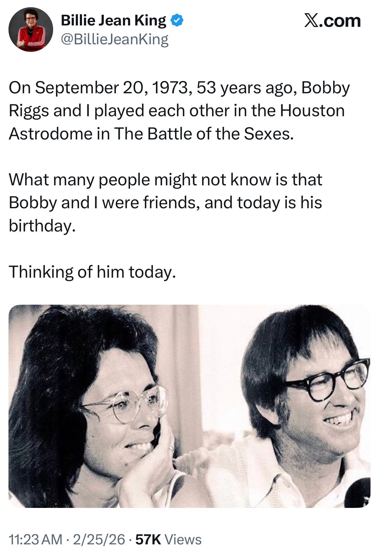 Last Wednesday, Billie Jean posted the below. Classy lady, she is.