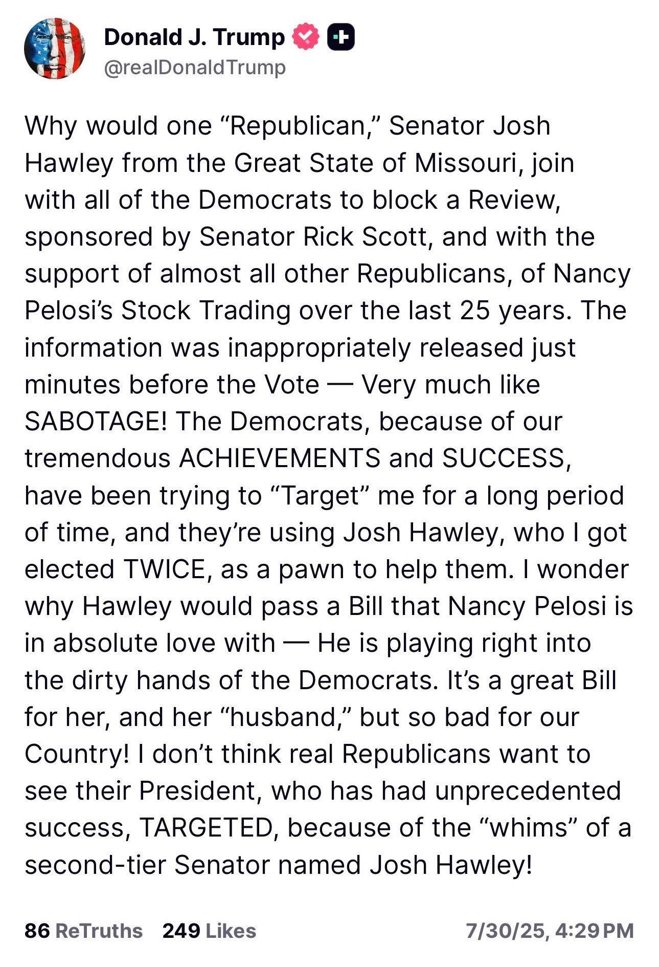 There is a lot to “unpack” here. But I would like to focus on one detail: Trump puts quotation marks around “husband.” Nancy Pelosi and “her ‘husband.’” He does the same thing when tweeting, or “truthing,” about Mitch McConnell and Elaine Chao—“his ‘wife.’”