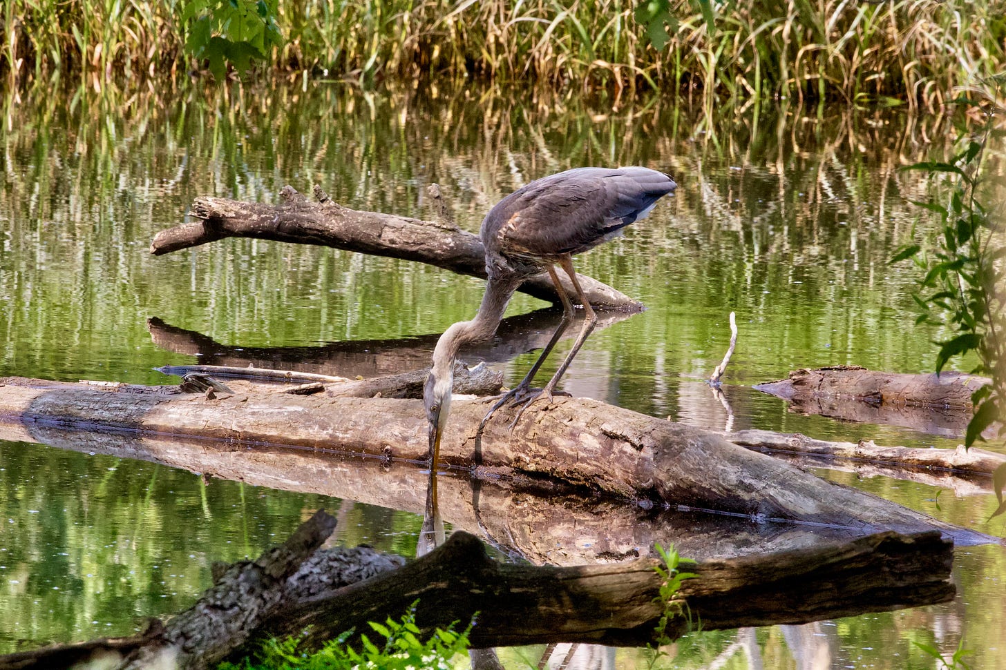Over the years, I have published bird photos—striking photos—by Hans Goeckner, a reader of ours who is a physicist in Chicago. He has sent me one of a Great Blue Heron, having “a long drink of cool water” (as Hans says).