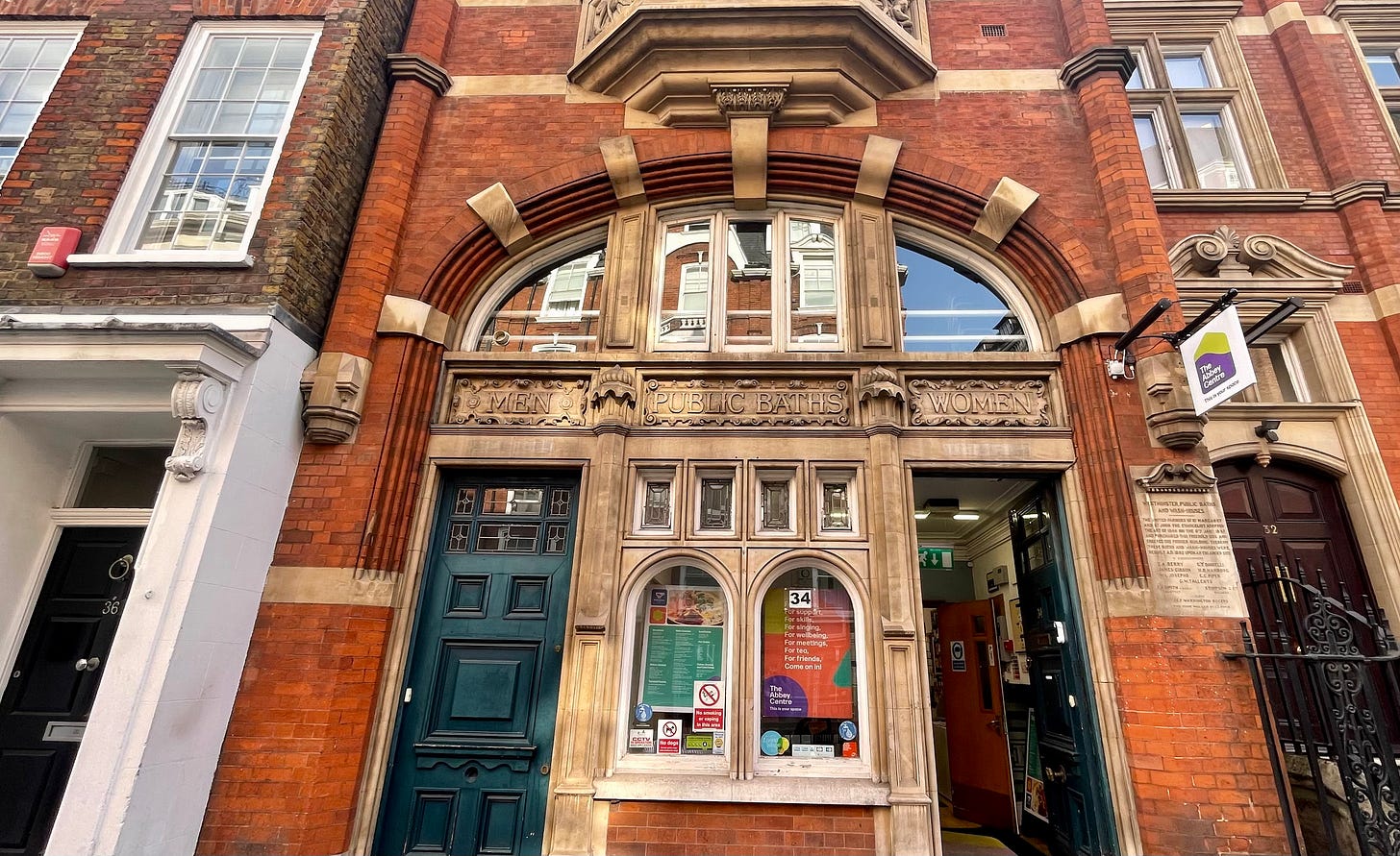 Return with me to Westminster for a second (the City of Westminster, where the Houses of Parliament and the Abbey and all that are). Etched into the façade is “Westminster Public Library.” I walk in. It’s a swanky Indian restaurant—but with many books, in a nod to the building’s past.