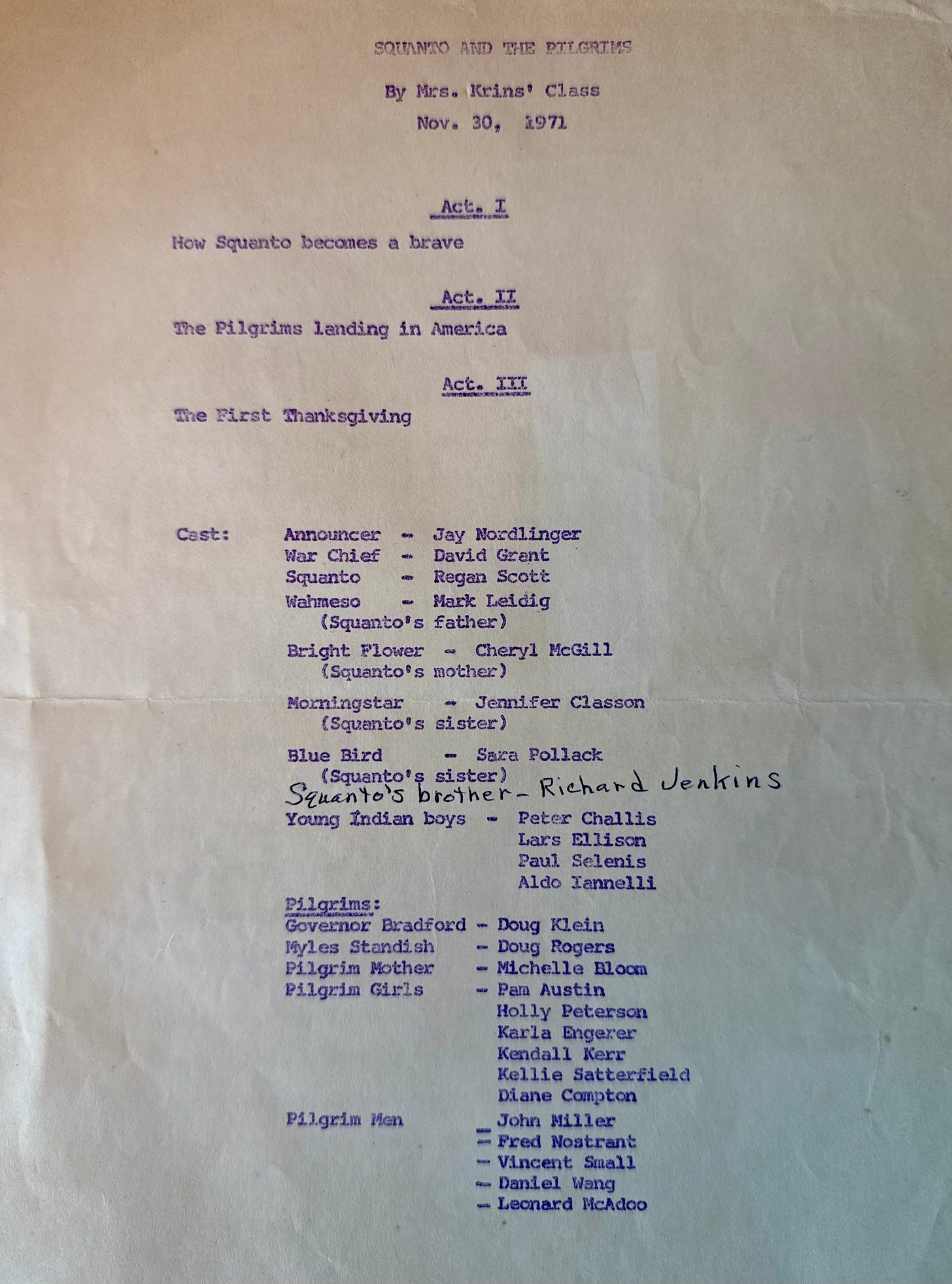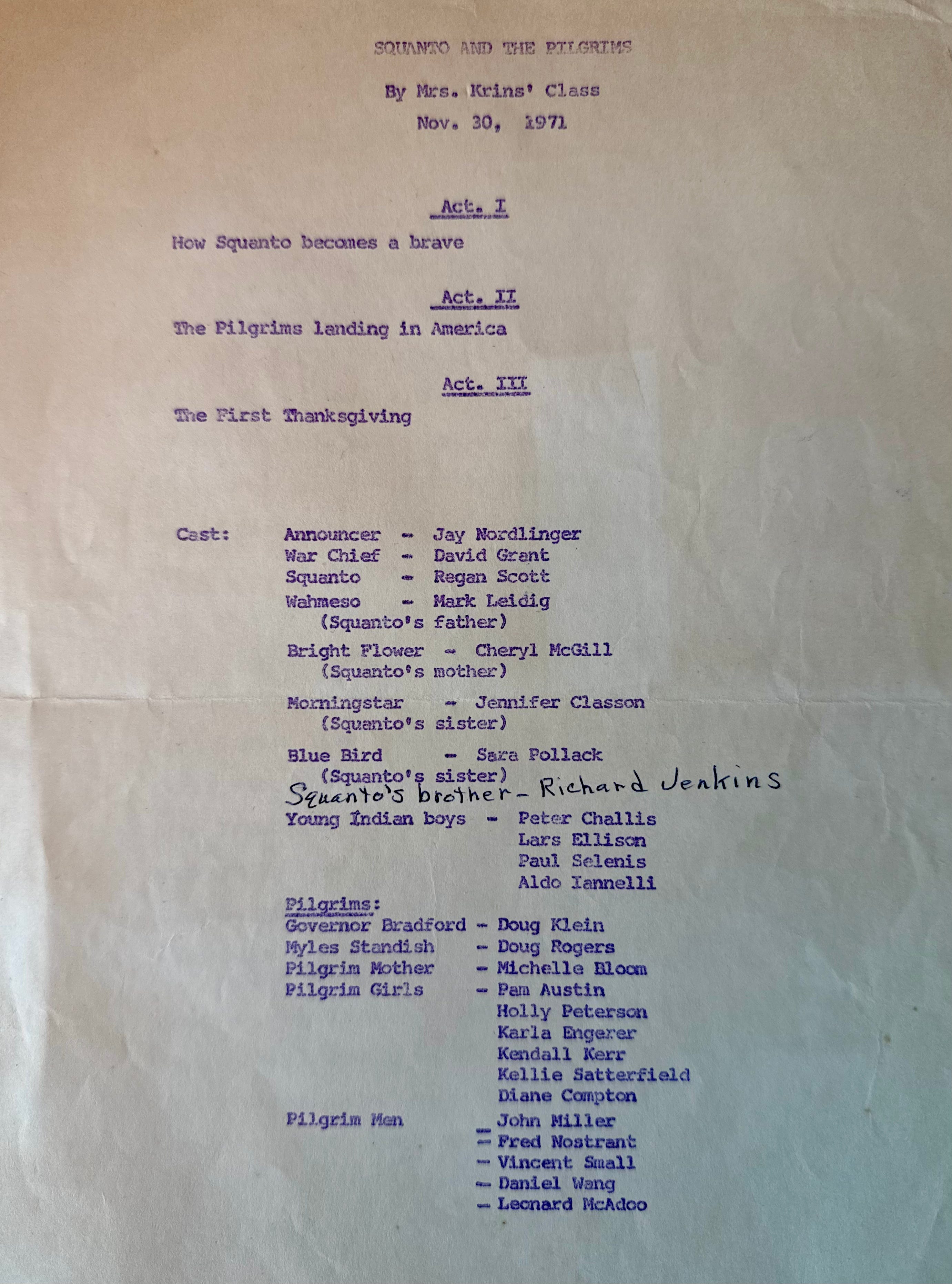 The artifact? The program of our Thanksgiving play in second grade. On November 30, 1971, specifically.