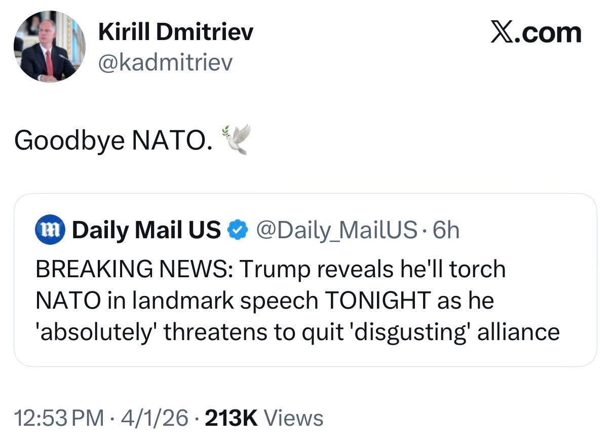 Kirill Dmitriev, as you know, is Putin’s envoy to the United States. A money-man, he is known as “Putin’s wallet.” His counterparts are Trump’s business partner, Steve Witkoff, and his son-in-law, Jared Kushner.