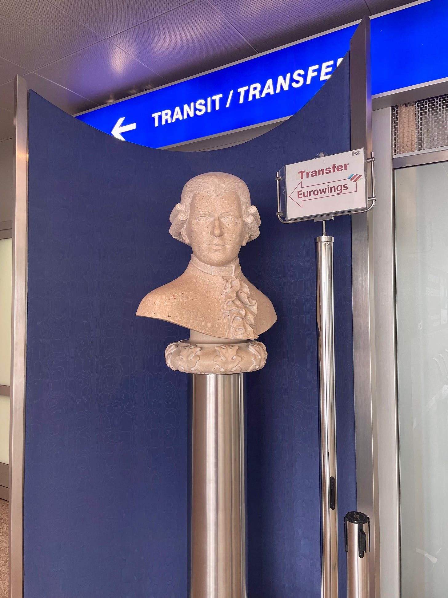 Who else would greet you in Salzburg but Mozart, or at least a bust of him? The airport here is named for him. We’re talking the “W. A. Mozart Airport.”