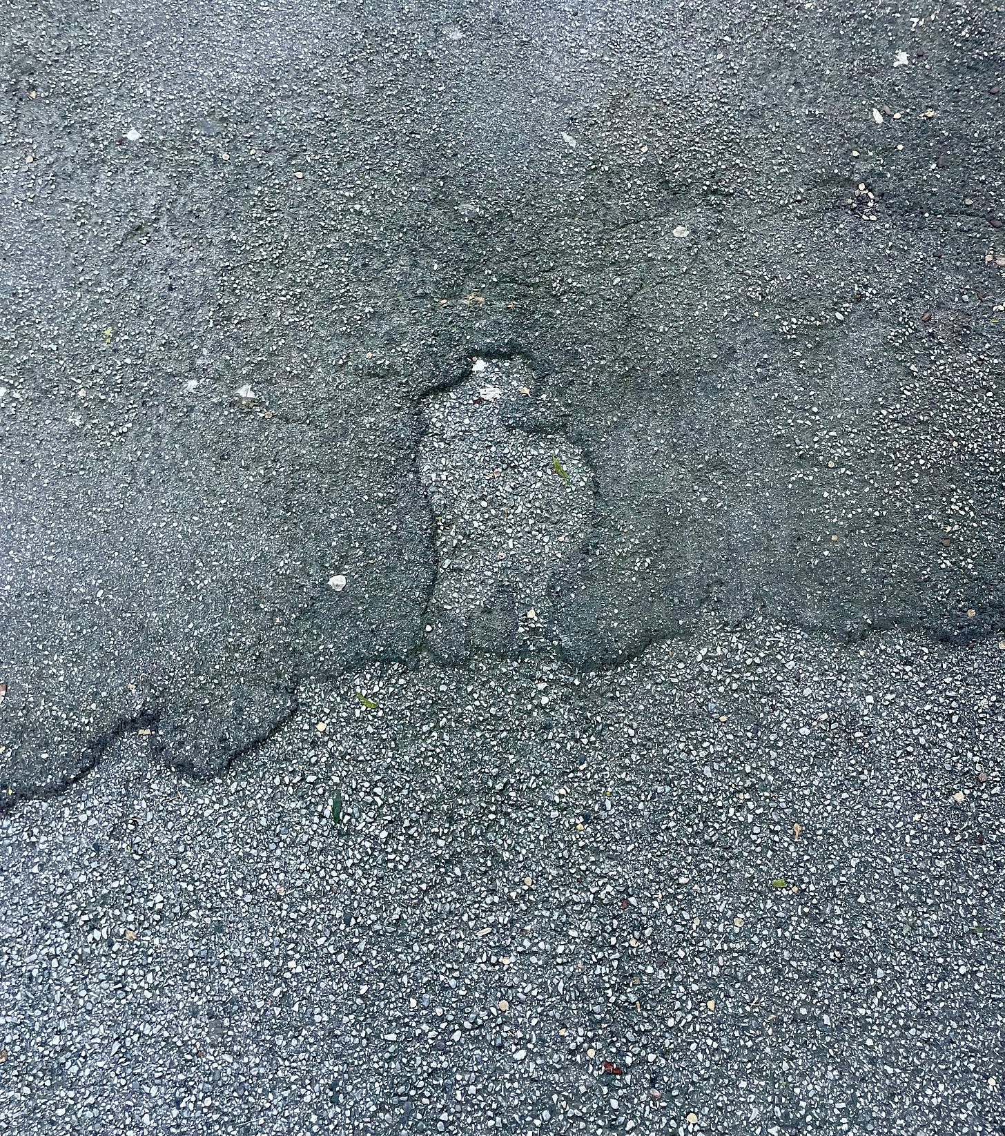 I have seen this thing for years and years—the same blemish in the pavement. The thing kind of sticking out, at the top in the center. And, so help me, it looks to me like my home state of Michigan: