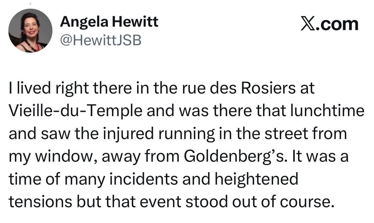In the Marais district (Paris), terrorists attacked a restaurant called “Chez Jo Goldenberg.” To English-speakers, it was “Jo Goldenberg’s.” A well-known place. The terrorists killed a bunch of people and injured many more.