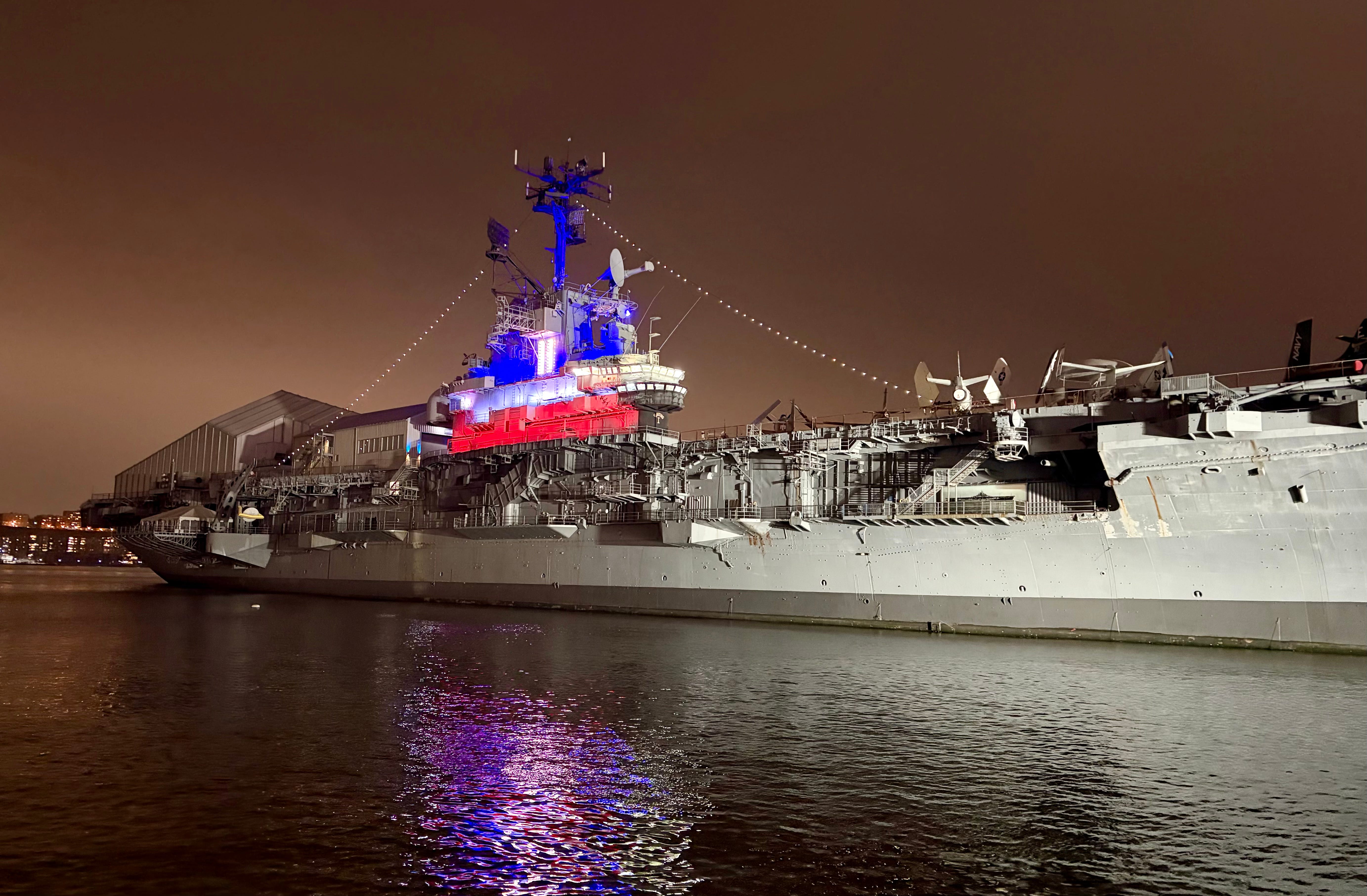 Here is a sight I like to snap: the USS Intrepid, in the Hudson River, at Manhattan, featuring what looks like a Bomb Pop: