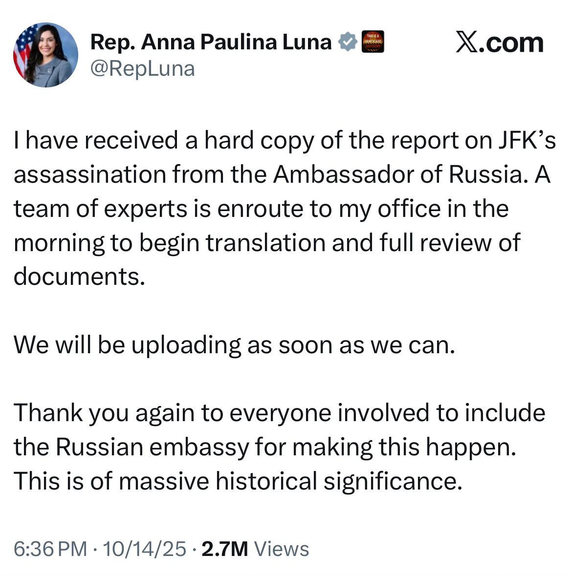 Congresswoman Luna has now met with a Putin envoy, Kirill Dmitriev. She put out a video of herself with Dmitriev, using some background music: the Beatles’ “Here Comes the Sun.”